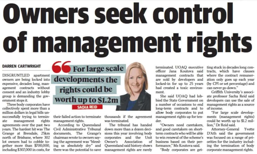In Queensland, NEDIS take the form of 25-year management agreements imposed by developers on future owners. These management rights are either held by the developer or sold to operators - in some cases for many millions, with developers pocketing the money. The result is that unit owners get services that they may not want at prices that are not tested in the market at regular intervals. It is a peculiar arrangement that is legal in Queensland but banned in New South Wales, for example, and was conceived to promote holiday accommodation in the last century.